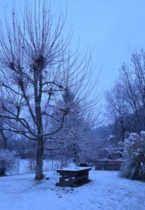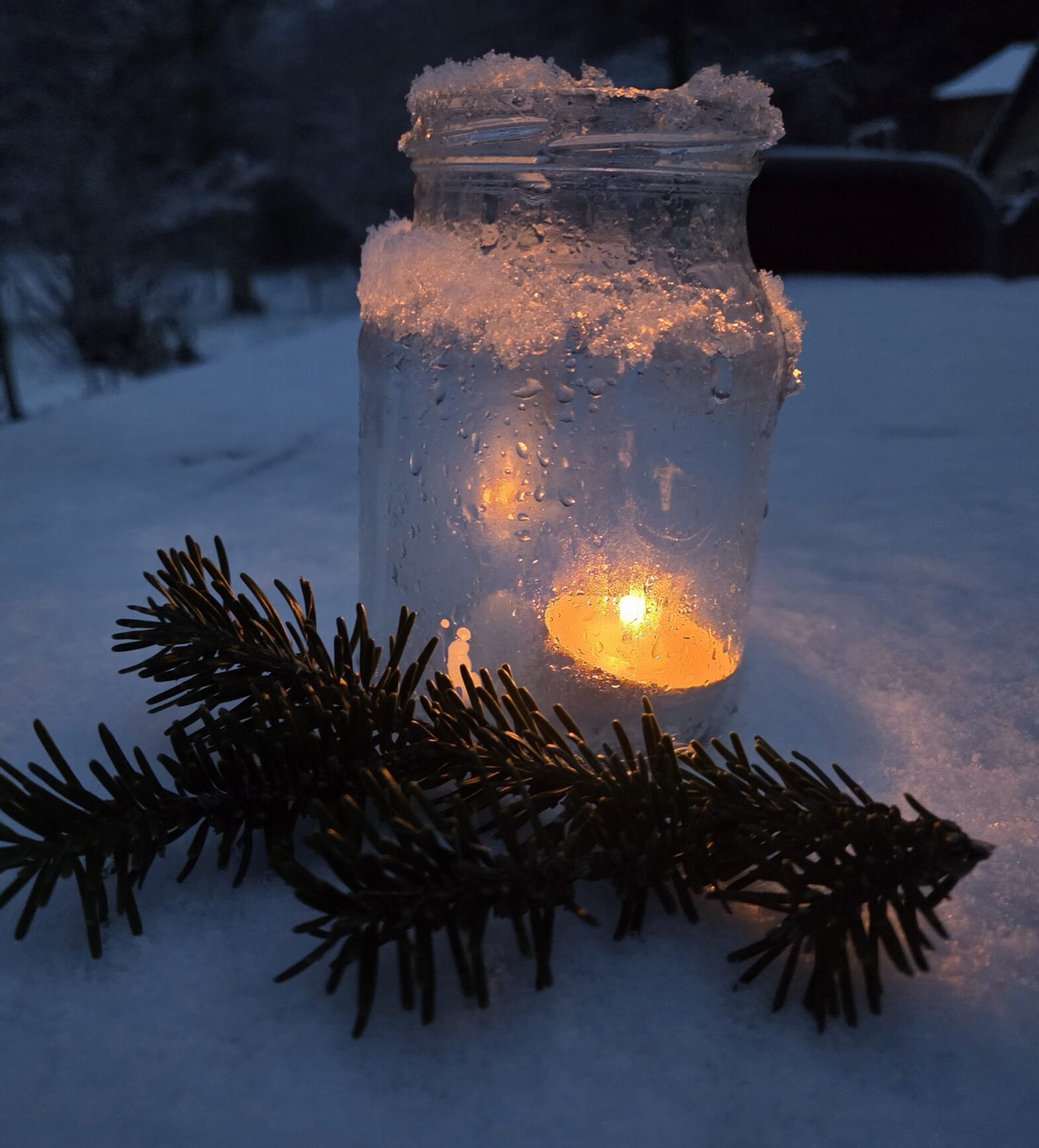 Es schneit wie prognostiziert heftig, trotzdem legt sich nur eine dünne Schneeschicht über die Landschaft. Tagsüber wird es wieder zu warm sein, sodass sich lästiger Schneematsch bildet. Ich schenke mir heute frühmorgendliche Stunden der Stille, gehe durch den verschneiten Garten und zünde eine Kerze am Gartentisch an. Das Frühstück nehme ich alleine ein, es ist noch dunkel. Ich genieße die Ruhe, denn es kommen trubelige, familienreiche, laute Tage auf mich zu.